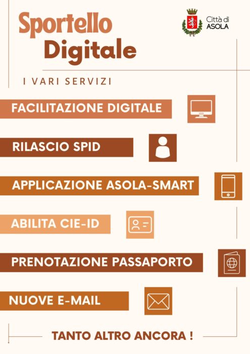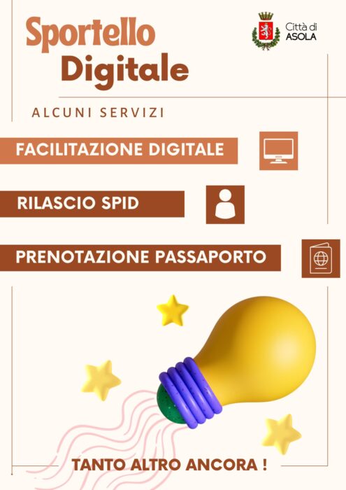Il Comune di Asola ha attivato lo 𝗦𝗣𝗢𝗥𝗧𝗘𝗟𝗟𝗢𝗗𝗜𝗚𝗜𝗧𝗔𝗟𝗘 per supportare gli utenti nell’utilizzo dei dispositivi tecnologici e dei servizi digitali online, aiutandoli a superare le difficoltà legate all’utilizzo delle nuove tecnologie e a navigare con maggiore sicurezza nel mondo digitale.