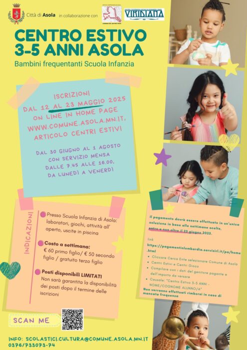 Il Centro Estivo si terrà presso la Scuola dell'Infanzia "F. Ziacchi" di Asola, dal 30 giugno al 1 agosto 2025, da lunedì a venerdì, con possibilità di frequenza part time (7:45-13:00) o tempo pieno (7:45-16:00), con servizio di mensa.