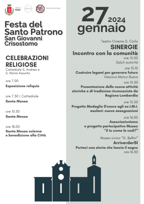 Il 27 gennaio, presso Teatro Cinema S. Carlo alle ore 15:00, nell’ambito delle celebrazioni della festa patronale di S. Giovanni Grisostomo, Asola accoglie il Vescovo Marco Busca per dialogare sui temi della lettera pastorale “Sinergie. Costruire legami per generare futuro”.