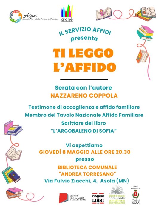 Giovedì 8 maggio presso la Biblioteca comunale di Asola Ti leggo l'affido con l'autore Nazareno Coppola. L'evento, a cura del Servizio Affidi Familiari dell'azienda ASPA, propone un incontro con l'autore del libro "L'arcobaleno di Sofia", testimone dell'affido familiare e membro del Tavolo Nazionale Affido Familiari.
